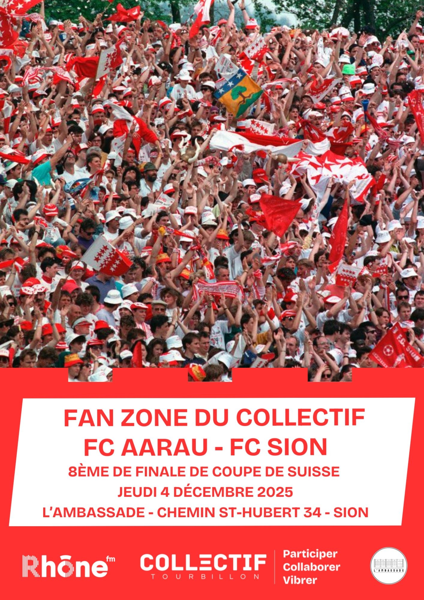 Le FC Sion est attendu au Brügglifeld d'Aarau le jeudi 4 décembre prochain (20h30) pour le compte des huitièmes de la finale de la Coupe de Suisse. À cette occasion, les supporters sédunois qui n'effectueront pas le déplacement en terres argoviennes pourront se réunir devant un écran géant. Comme cela avait déjà été le cas l'an dernier lors du match entre Bâle et le club valaisan, le Collectif Tourbillon a en effet décidé d'organiser une fan zone à l'Ambassade à Sion. Rhône FM participera à cette soirée en tant que partenaire de l'événement. Une émission spéciale débutera sur place dès 20h00, soit une demi-heure avant le coup d'envoi. Le programme complet ainsi que la liste des invités présents seront communiqués prochainement.